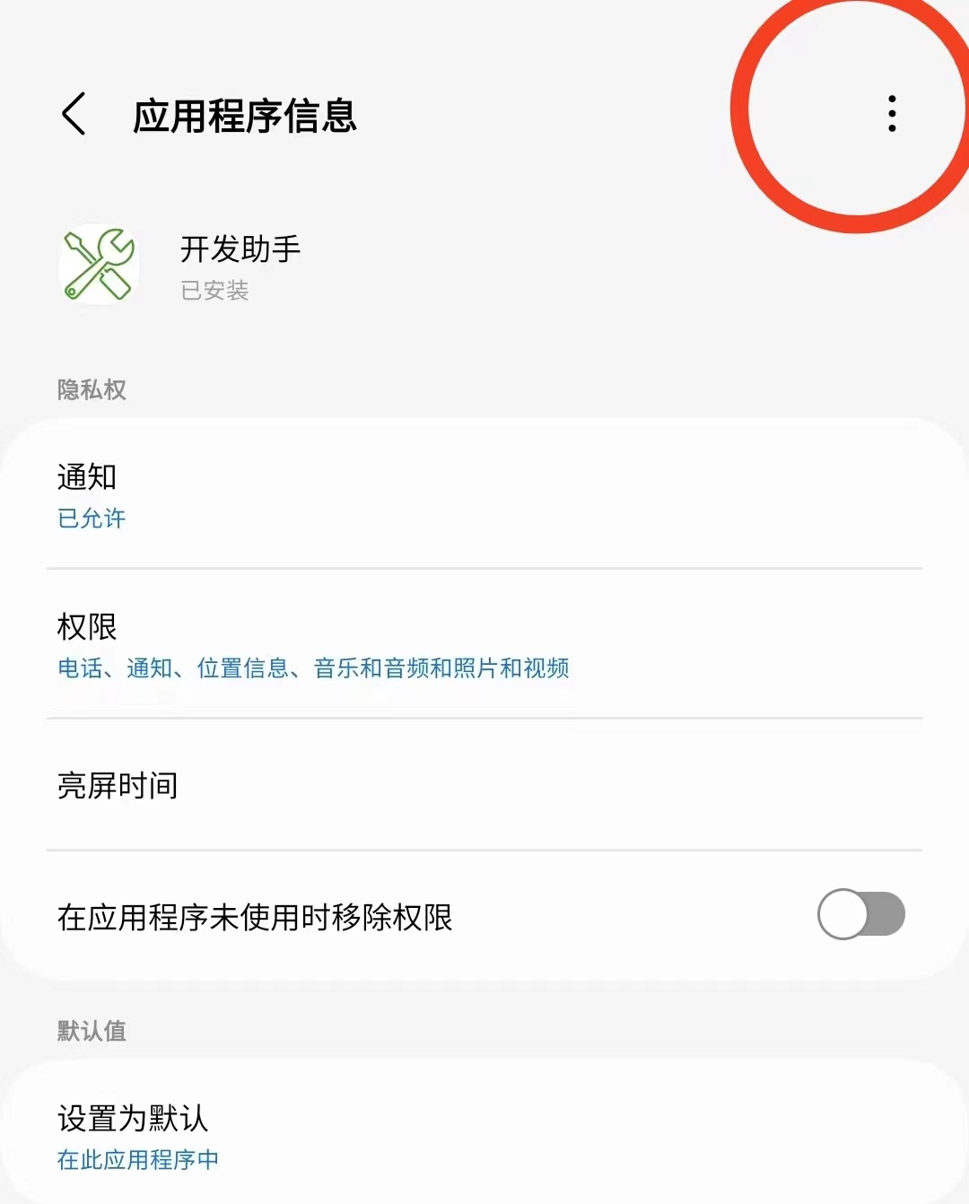 Solution: This is an Android system limitation, especially on Android 13 and above. Open "System Settings" -> "Application Management" -> "Dev Tools", then click the "More" button in the upper right corner. There is "Allow restricted settings", click to open, as shown in the screenshot below: