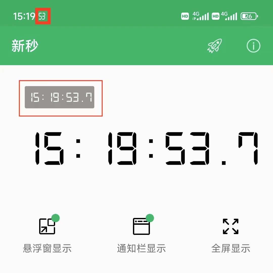 Solution: You can download "New Second" App. It can be used to view second and millSecond quickly, it can be used as an auxiliary tool for precise timing, shopping fixed-point snap-up and other scenarios. It support floating window, status bar, fullscreen view mode.